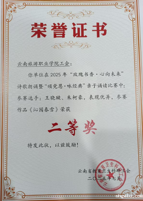 7月15日至17日,由云南省教育卫生科研工会主办的“玫瑰书香·心向未来”诗歌朗诵暨“颂党恩·咏经典”亲子诵读比赛在五华区青少年宫成功举办。我校教师李婉、李婧瑜、谢梓菲、王思婕、李佳颖朗诵作品《以你为镜》在“玫瑰书香·心向未来”项目中披荆斩棘,荣获二等奖;教师王晓璇作品《沁园春·雪》在“颂党恩·咏经典”亲子诵读比赛中荣获二等奖。