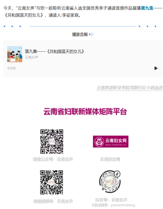 在云南省妇联“书香润家风 亲子共成长”家庭亲子阅读活动中,我校党群妇女小组李娑家庭选送的亲子诵读作品《共和国蓝天的女儿》突出重围进入全省10强,并入选全国妇联“2025年全国家庭亲子诵读活动”优秀作品,在中央人民广播电视总台“云听”APP及“云南女声”微信公众号中进行展播。