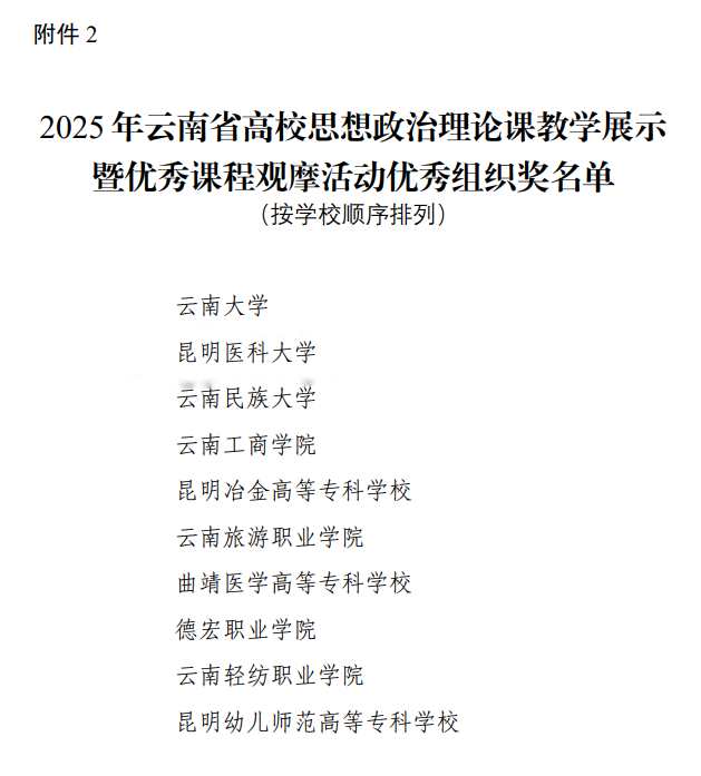 近日,由中共云南省委教育工委主办,云南省高校各课程教研中心承办的2025年云南省高校思想政治理论课教学展示暨优秀课程观摩活动在云南民族大学落下帷幕。我校马克思主义学院4名参赛教师,共斩获3个一等奖、1个二等奖,我校荣获优秀组织奖。