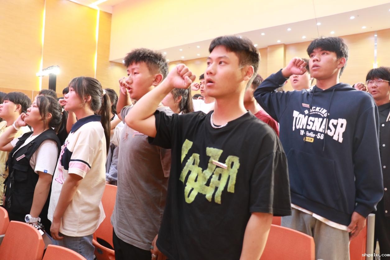 在全体师生的见证下,在校歌的音乐声中,与会校领导为2023级8名新生代表佩戴校徽。新生代表、文化艺术学院的李新宇同学带领2023级全体新生举行学习宣誓仪式。
